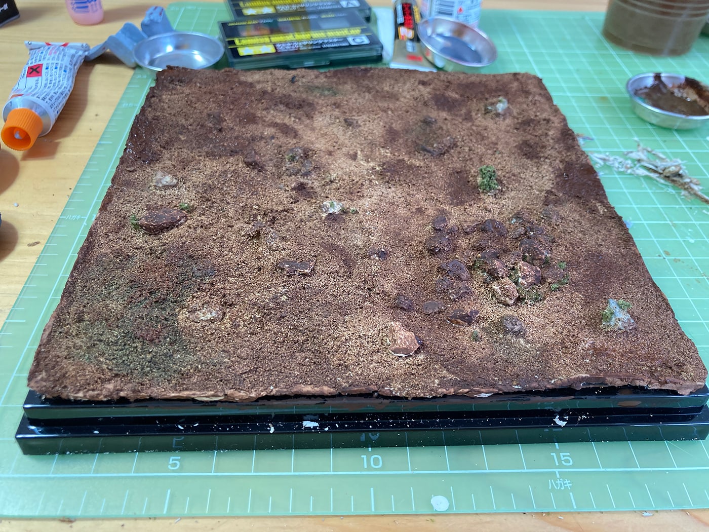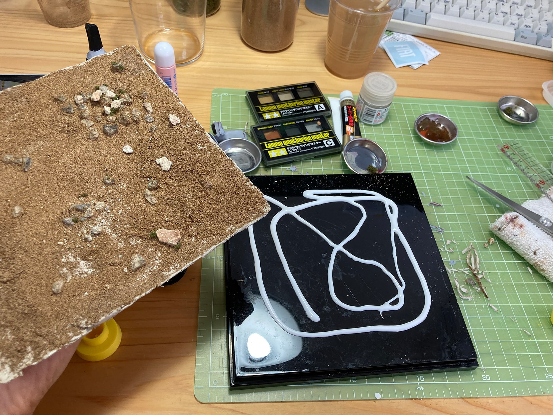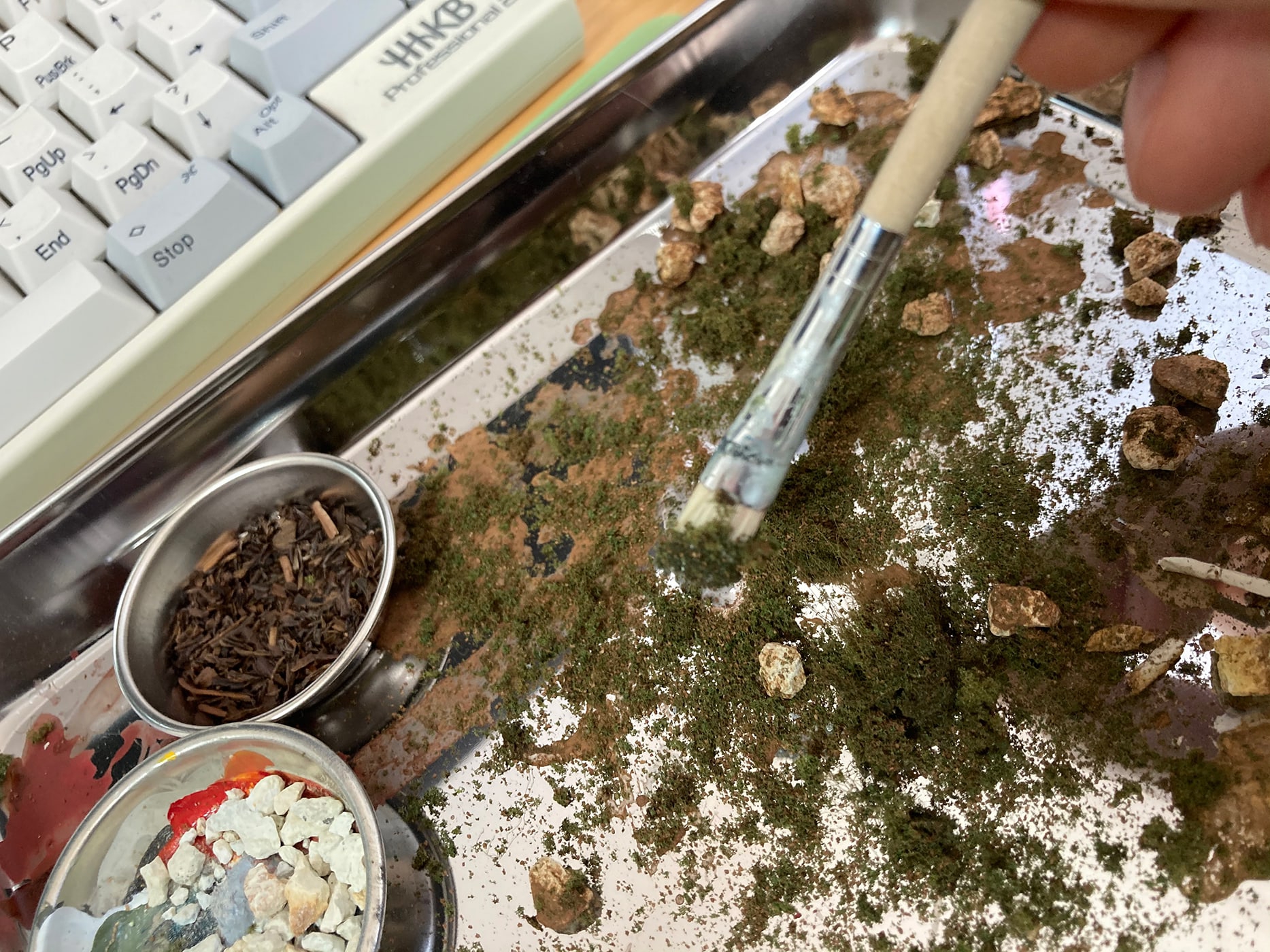 山中をイメージしていたので、砂の色を茶色に着色しました。乾くとまた色が変わるので、色味が難しい。