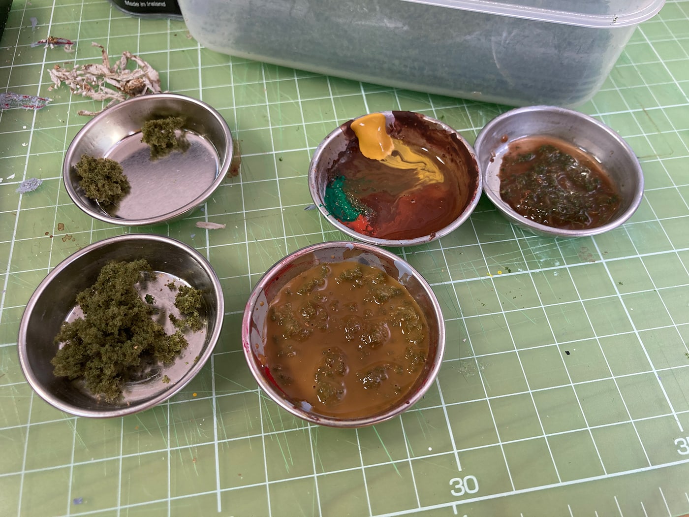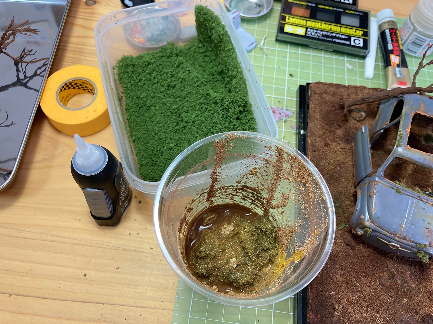 木の葉っぱとなるスポンジみたいなのの色がイメージとかけ離れていたので、絵の具と砂と混ぜました。この方法が合っているのかはわかりません。