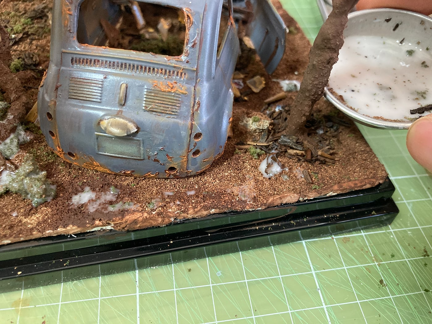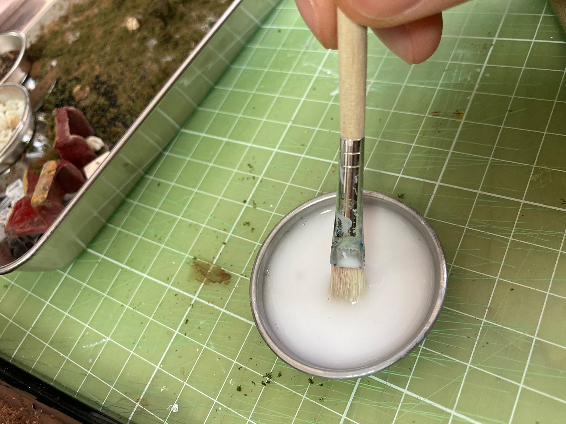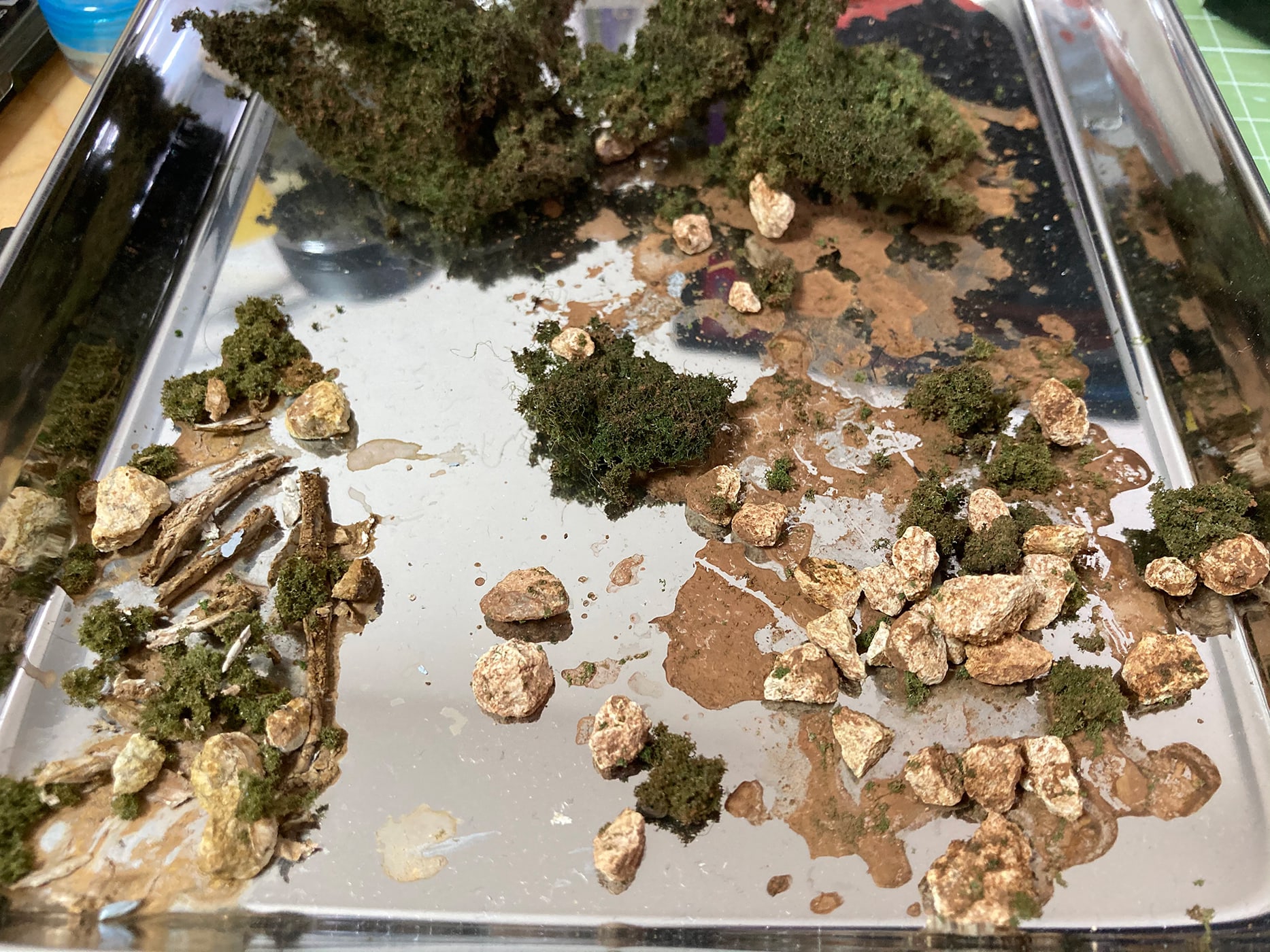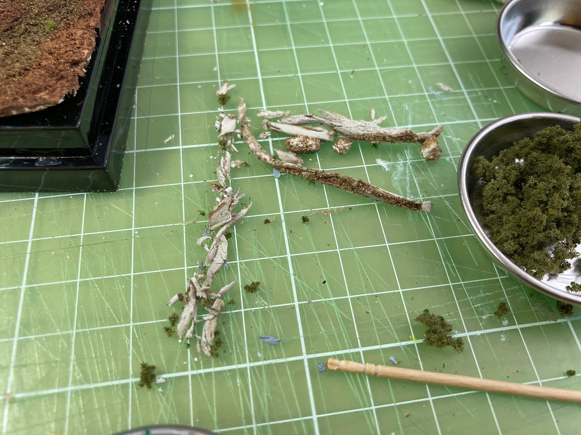 茶葉を撒きました。木の葉っぱもいつのまにか進んでいます。木工ボンドで木の葉っぱはくっつけていましたが、繊細な部分をくっつけるには難しかったので、別の接着剤を探しました。模型用の接着剤がありましたが、高かったのでロックタイトの瞬間接着剤を使いました。かなり塗りやすくなりました。しかし接着剤が見えると白く見えるので、隠すようにうまく塗る必要があります。