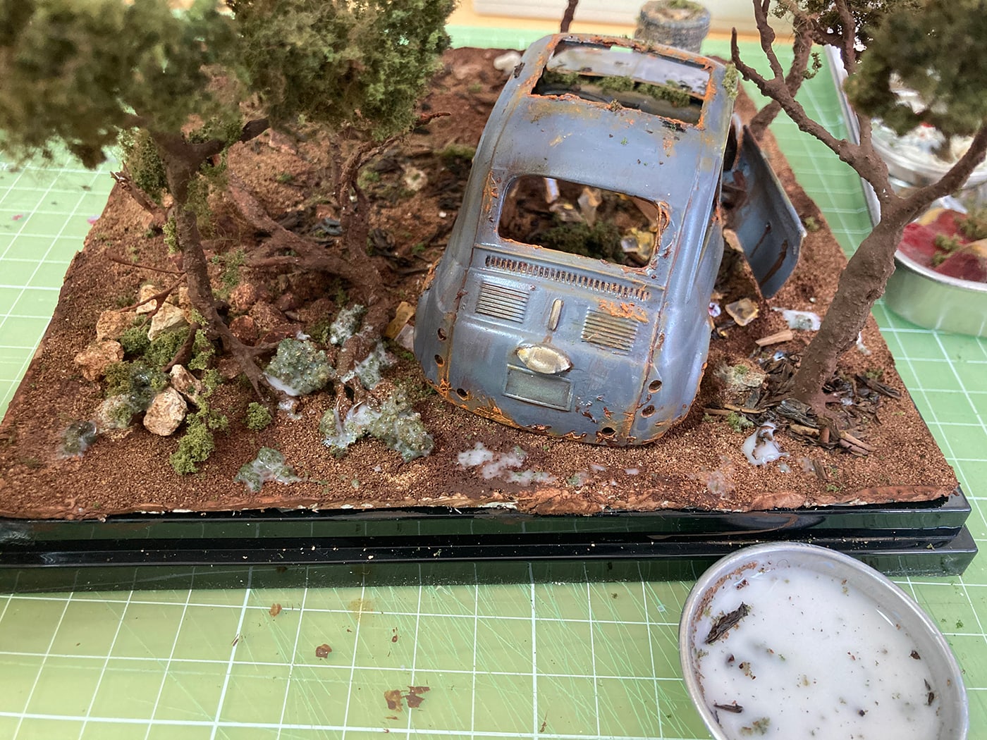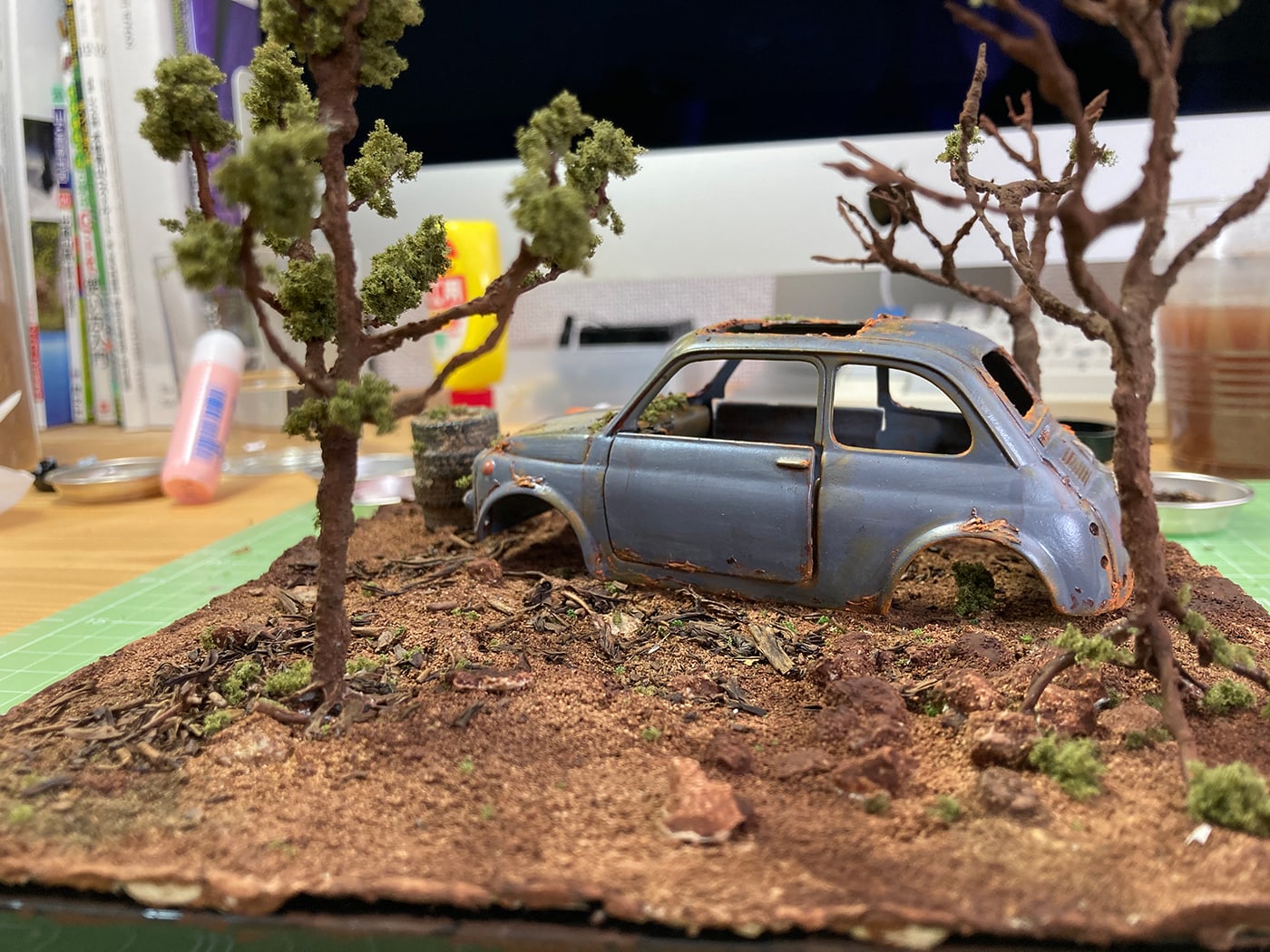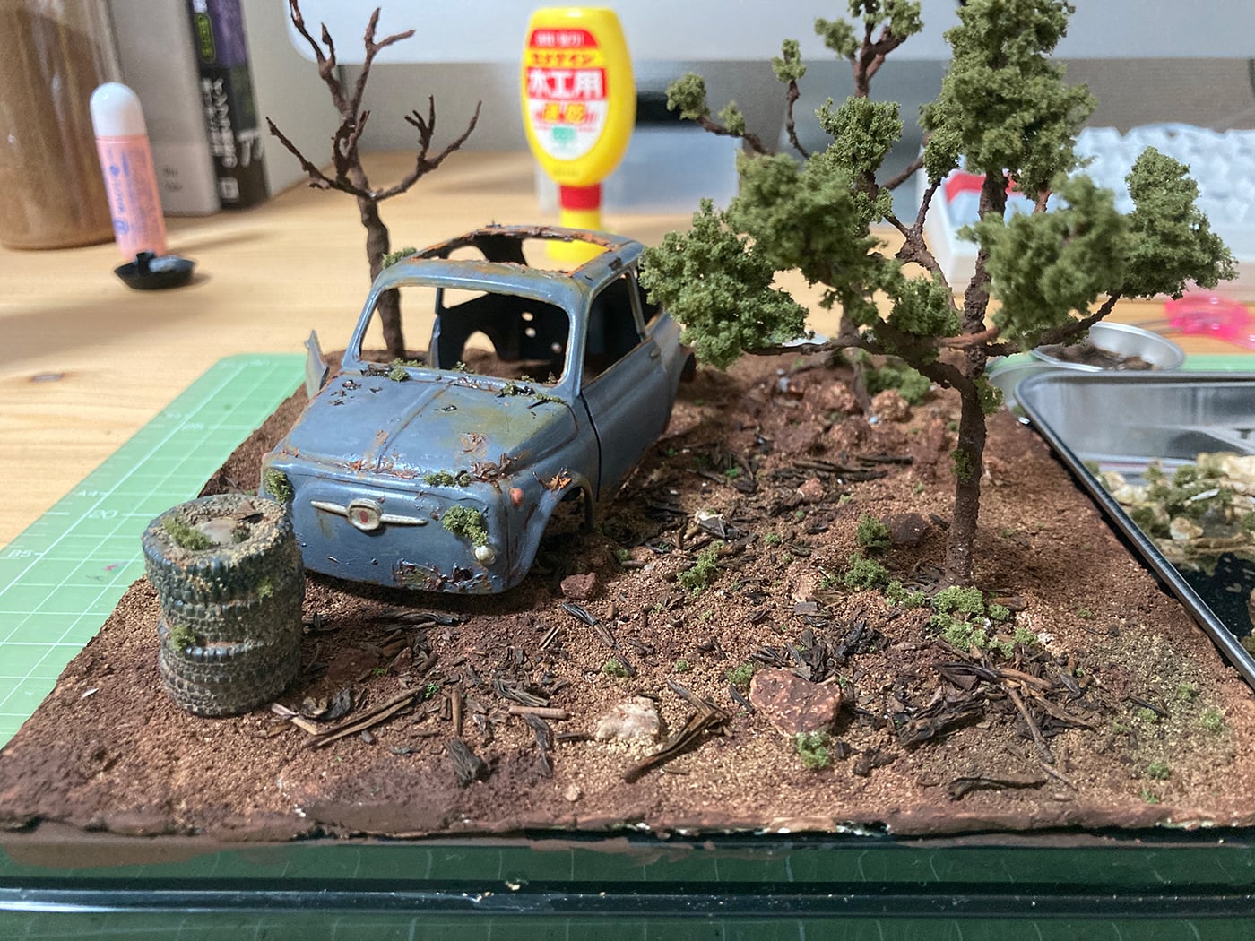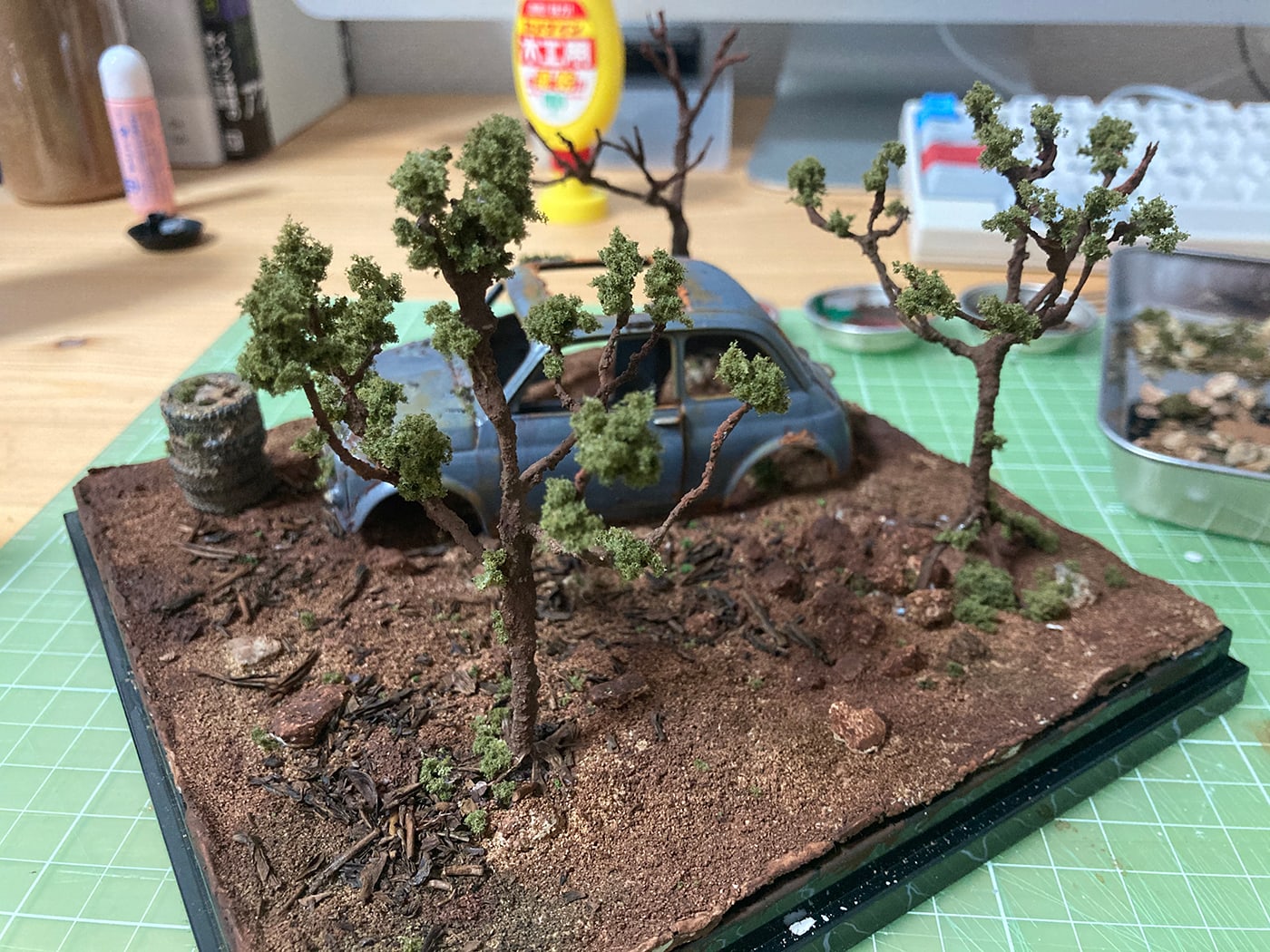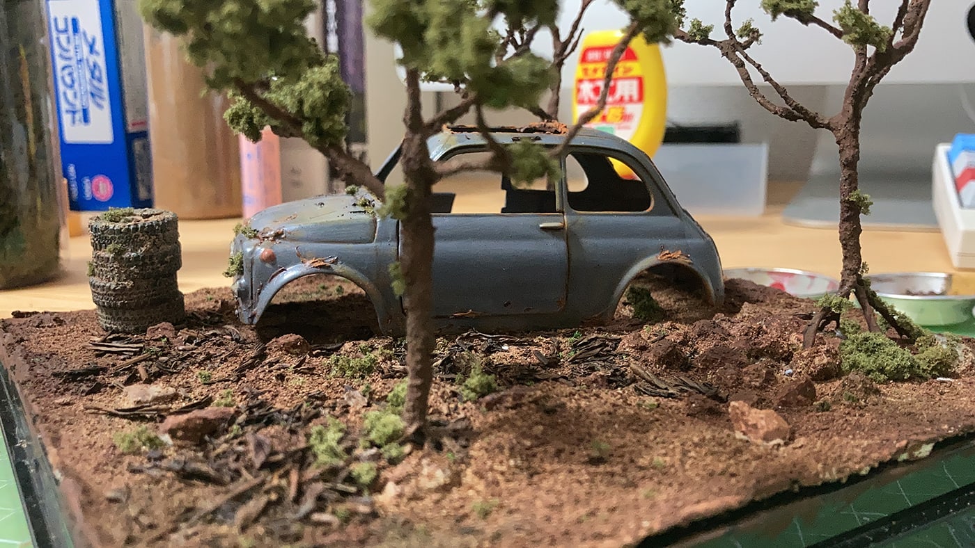 ジオラマで感動した事が今までなかったので、まさか自分がジオラマを作ることになるとは思いませんでした。やればやるほどボディの成形の甘さが気になってしまい、構造が実車と違うのでどこまでパテで埋めて再現すべきか悩みながらの作業でした。かなり期間が掛かっていますが、平日はやっていなかった期間が多いので、作業日だけで換算すると数ヶ月も掛かっていないはずです。結構満足いく出来に仕上がりました。時間はかかるけど簡単なので、興味があれば是非チャレンジして見てください!